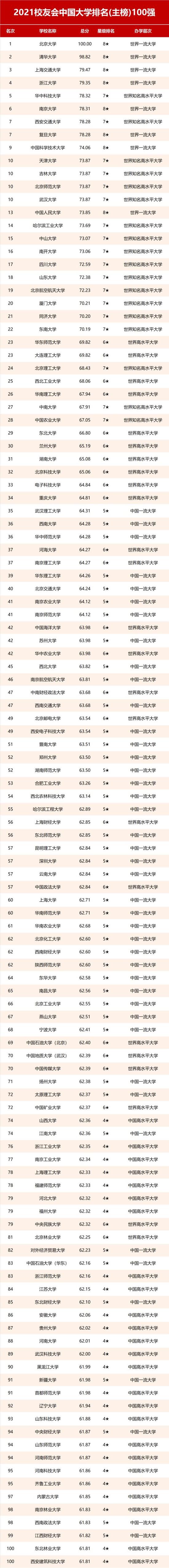 2021校友会中国大学排名(主榜)100强