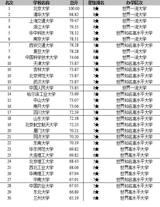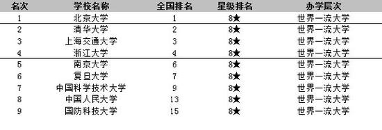 在最新2021校友会中国大学星级排名中,北京大学、清华大学、上海交通大学、浙江大学、南京大学、复旦大学、中国科学技术大学、中国人民大学和国防科技大学等高校荣膺2021中国八星级大学(8★)美誉,办学水平达到世界一流水平,晋升世界一流大学行列,成为中国高校“双一流”建设的领跑者。