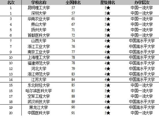 值得关注的是,福建师范大学、东北财经大学、贵州大学、山东科技大学、河南师范大学、南京林业大学、西南政法大学、江西财经大学、西安建筑科技大学等高校晋升全国100强。从全国各地区入选前100强高校数来看,北京26所,江苏15所,上海10所,雄居全国前3强。湖北和陕西各9所,广东和山东各6所,河南、黑龙江和辽宁各5所。其余省份少于5所。广西、海南、宁夏、青海和西藏等5省区没有高校跻身百强行列。