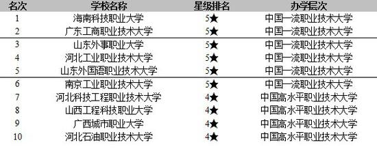 在最新2021校友会中国高职(专科)院校排名中,广东轻工职业技术学院、深圳职业技术学院、山东商业职业技术学院勇夺2021校友会中国高职院校排名榜首。海南科技职业大学、广东工商职业技术大学、山东外事职业大学雄居2021校友会中国职业技术大学排名前3强。